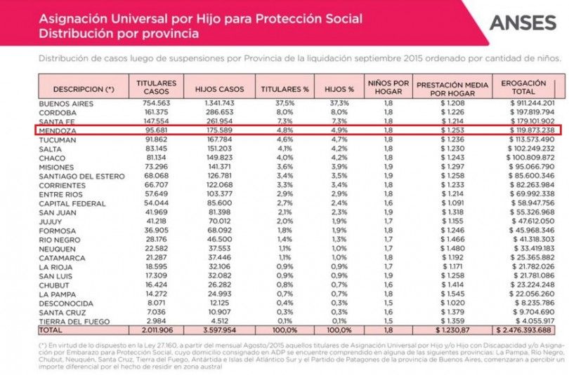 En octubre de 2015, en Mendoza un total de 95.681 personas cobraban la Asignación Universal por Hijo. Según la información actualizada de Anses, en la provincia hoy son 179.952 las beneficiarias de esta ayuda social. Es decir que en el último año, el programa social de la ANSeS sumó a 84.271 beneficiarios.