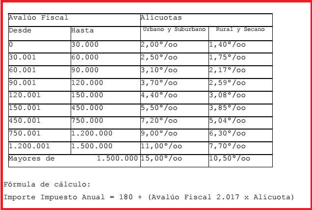 De esta forma, una vivienda valuada entre $1.200.001 y $1.500.000, ubicada en zona urbana o suburbana, debe tributar un 11 por mil - fórmula de cálculo: Importe Impuesto Anual = 180 + (Avalúo Fiscal 2.017 x Alícuota)-.