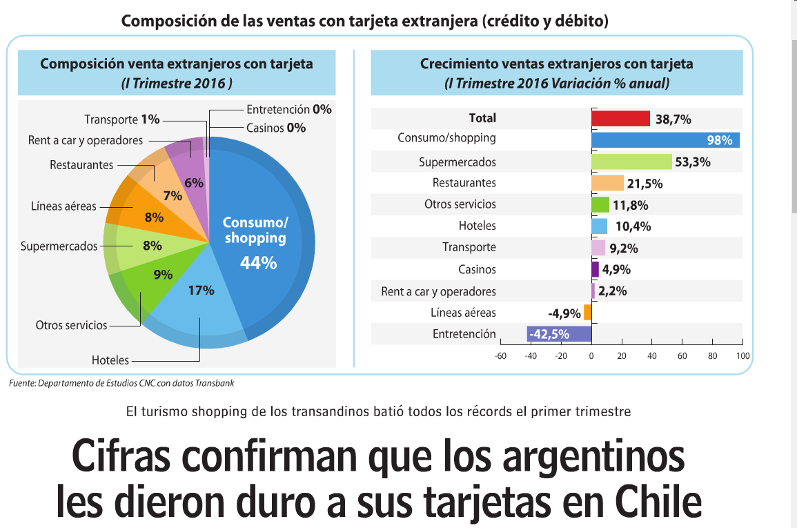 De acuerdo con un informe de la Cámara Nacional de Comercio de Chile, con cifras de la empresa Transbank, los extranjeros gastaron 629 millones de dólares a través de compras con trajetas, ya sea débito o crédito.