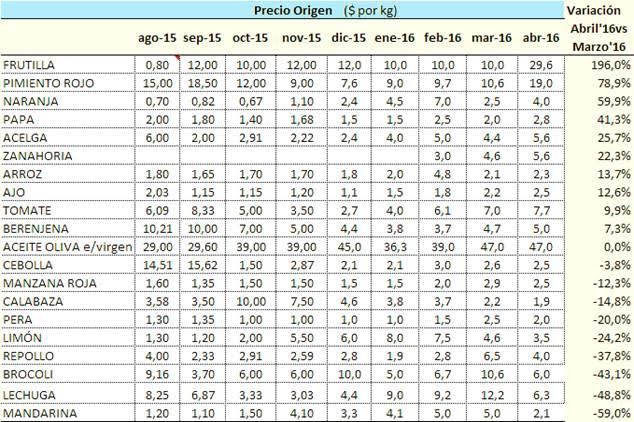 En abril continuaron mejorando los precios al productor en una amplia cantidad de elaboración. El aumento más importante ocurrió en la frutilla, donde el agricultor recibió 196% más que en marzo por el kg de su cosecha. Como dato positivo, los precios al consumidor de frutilla sólo subieron 16% y eso derivó en que la brecha de precios de origen y destino haya descendido a 3,1 veces desde el 7,92 alcanzado en marzo.