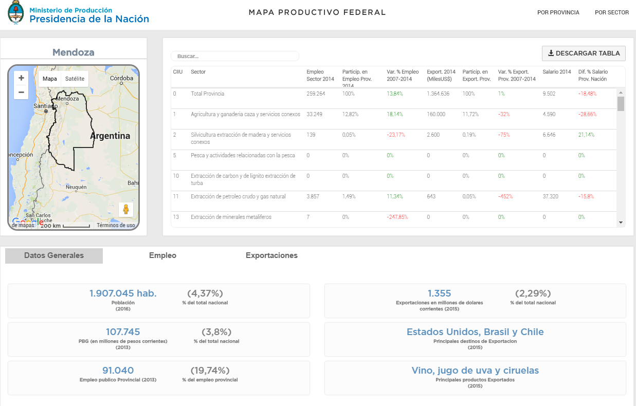 La plataforma reúne información productiva federal relevante, y ayuda a identificar los sectores para cada provincia (que se clasifican de acuerdo a su dinamismo y especialización, por ejemplo). A partir de este conocimiento, se puede trabajar en la diversificación de la matriz productiva, y ayudar así a cumplir el objetivo de generar más y mejor empleo.