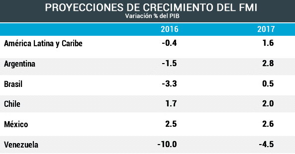 El FMI advirtió que "el impacto adverso" de la "transición" económica fue "mayor de lo previsto". Sin embargo, el organismo vaticinó que el PBI mejorará a lo largo de 2017, para registrar un crecimiento en torno al 2,8 %. Hacia el 2017, la economía de América Latina y el Caribe podría crecer un 1,6%, de acuerdo con el FMI.