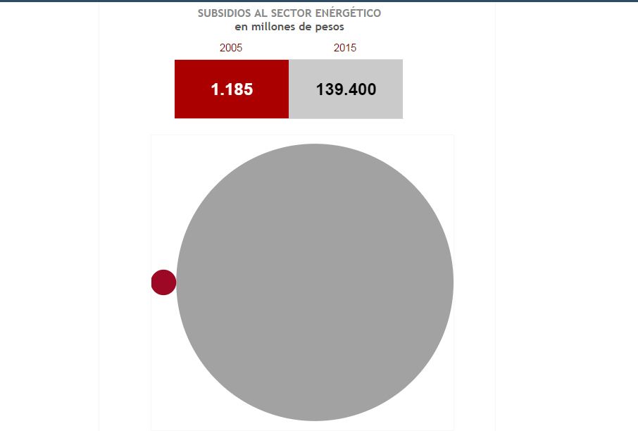 Hoy, cuando uno paga la luz, sólo abona el 15% de lo que fue el costo medio de la generación de esa electricidad que llegó a casa. ¿Con qué se cubre el 85% restante? Con subsidios, sobre todo. ¿Cuánto dinero le significó todo eso al país? De $ 1.185 millones (2005) a $139.400 millones (2015). Una forma más visual de expresarlo es así: