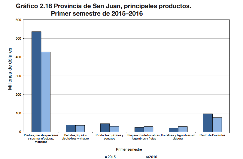 El 2,3% del total de ventas del país lo genera San Juan y el 68,3% del total de lo que exporta son piedras, metales preciosos y sus manufacturas -oro-. Luego le siguen productos farmacéuticos (3,5%) y bebidas, líquidos, alcohólicos y vinagres -principalmente vino de uva-.