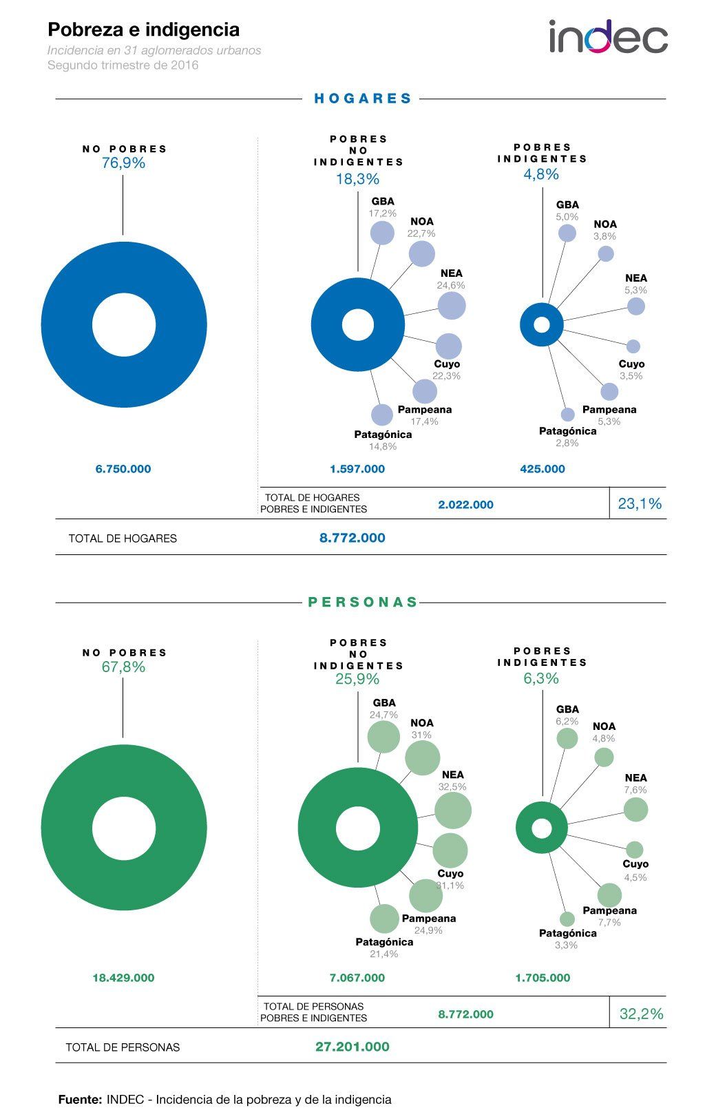 Al tomar en cuenta cifras de 31 aglomerados durante al segundo trimestre del año, un 32,2% de las personas eran pobres, mientras 6,3% indigentes.