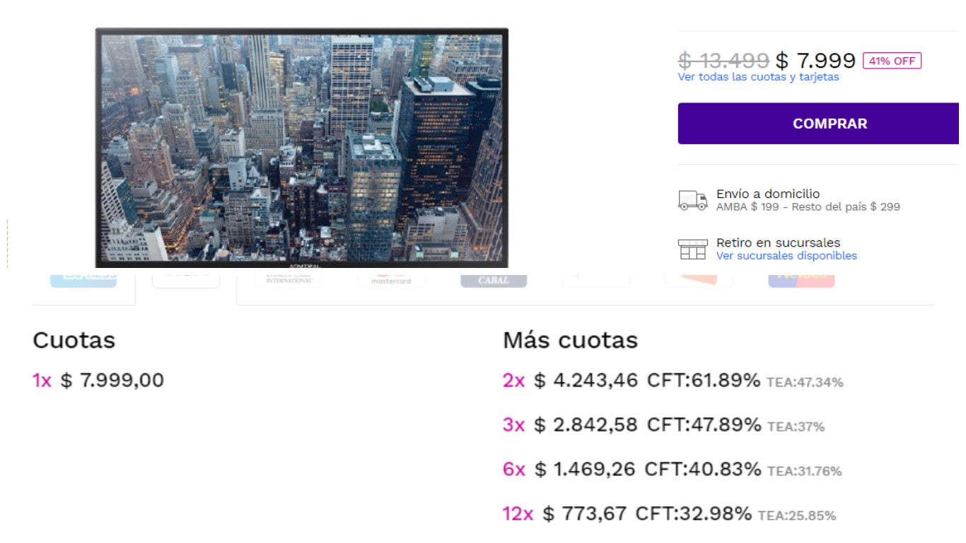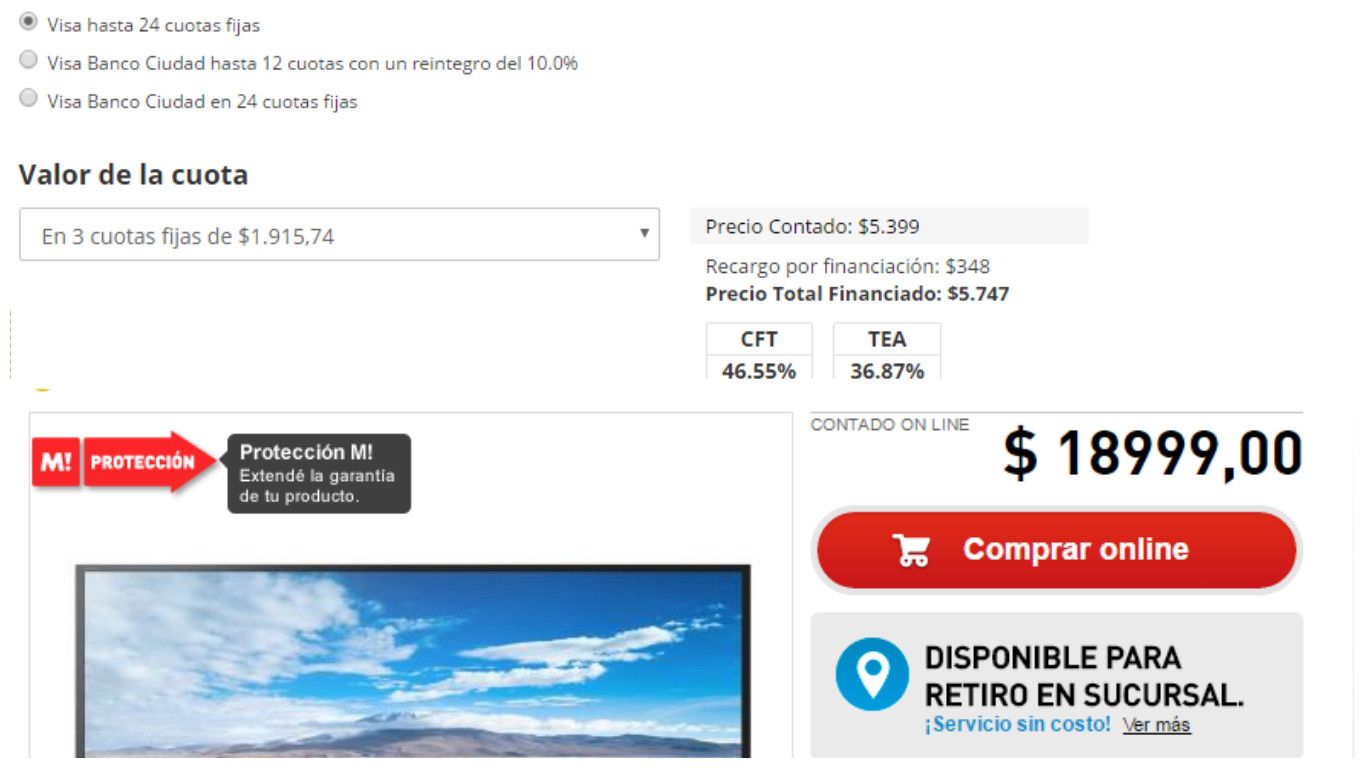 Por ejemplo, un televisión Led en la cadena Garbarino cuesta $5.399 si se compra de contado o en una sola cuota, pero si se opta por una financiación a 24 cuotas fijas el recargo será de $348 y al año se habrá pagado un 46,55% más sobre el valor del producto (Costo Financiero Total).