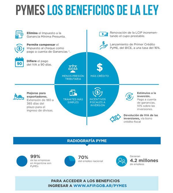 La Secretaría de Emprendedores y Pyme de la Nación anunció que ya ya 210 mil empresas en todo el país que ya acceden a los beneficios de la Ley Pyme, sin embargo las empresas que podrían estar incluidas son aproximadamente 800 mil.