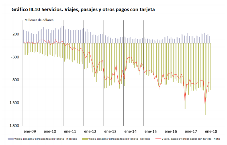 Este gráfico del BCRA es muy elocuente y muestra, desde enero de 2009 hasta enero de 2018, lo que fue la gran fuga de dólares solo para compras en el exterior con tarjetas y para turismo. Esto fue una de las causas de la crisis cambiaria del último mes, cuando el mercado dijo "basta" y llegó la devaluación y la reaparición del Fondo Monetario Internacional en el escenario argentino. Y también Hugo Moyano con una arenga que se ha hecho pública y que recuerda al Saúl Ubaldini en tiempos de Raúl Alfonsín: "Ya empezó la pelea. Descansen bien el fin de semana porque el lunes empezamos con todo".