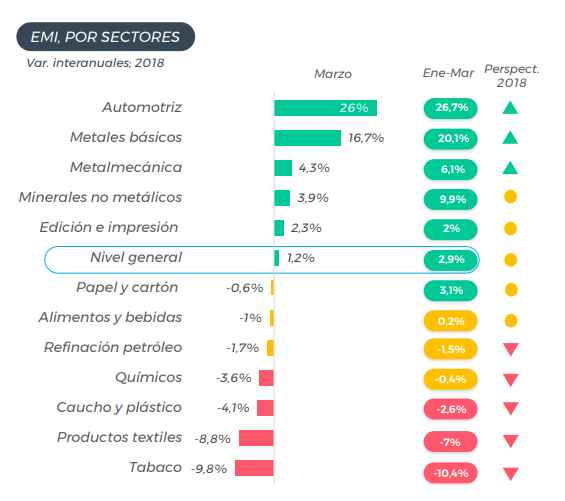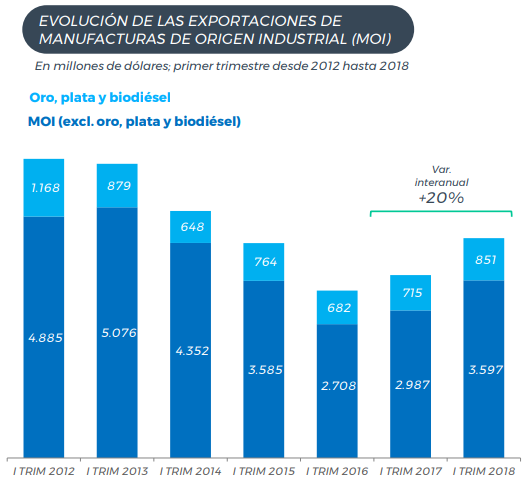 Según el Ministerio de Producción, hasta un mes antes de la crisis cambiaria con devaluación, las ventas de manufacturas industriales registraban el mayor crecimiento en 8 años. En el primer trimestre, el rubro tuvo ventas por casi US$ 4.500, 20% más que en el mismo período de 2017. Los precios aumentaron casi 6%, y las cantidades cerca de 14%