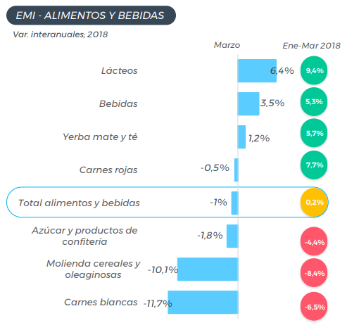 Luego de la caída de 1,4% de 2017, el sector logró cerrar el primer trimestre en positivo. Los incrementos acumulados en lácteos (+9,4%) y bebidas (+5,3%) impulsaron esta mejora. Carnes rojas continuó como uno de los sectores con mayor expansión (+7,7%).