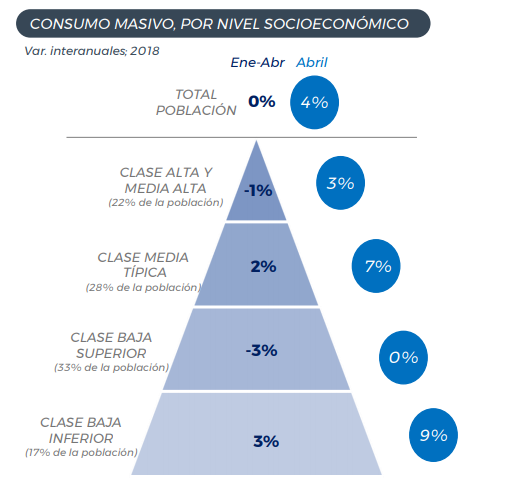 Lo +. Los hogares de ingresos medios y bajos aumentaron su consumo. El alza fue del 3% en las familias de ingresos más bajos y de 2% en los hogares de ingresos medios, frente al primer cuatrimestre de 2017. Este crecimiento se aceleró en abril, con alzas del 9% y 7%.