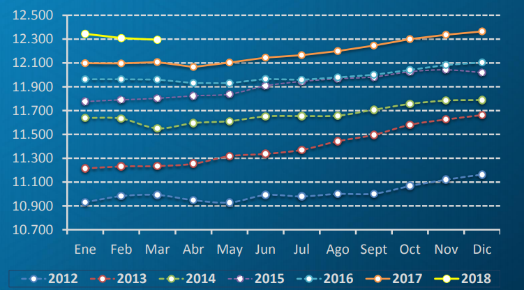 En cuanto al empleo registrado, el reporte laboral de mayo de 2018 del Ministerio de Trabajo, Empleo y Seguridad Social, muestra la evolución de los trabajadores registrados en el país (en miles):