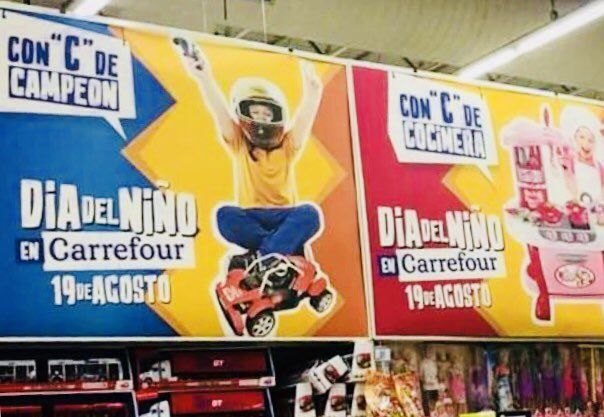 Allí, jugando con la letra C y previo al Día del Niño, Carrefour definió a los potenciales agasajados como "campeones", en el caso de los varones, y "cocineras", en el caso de las mujeres.