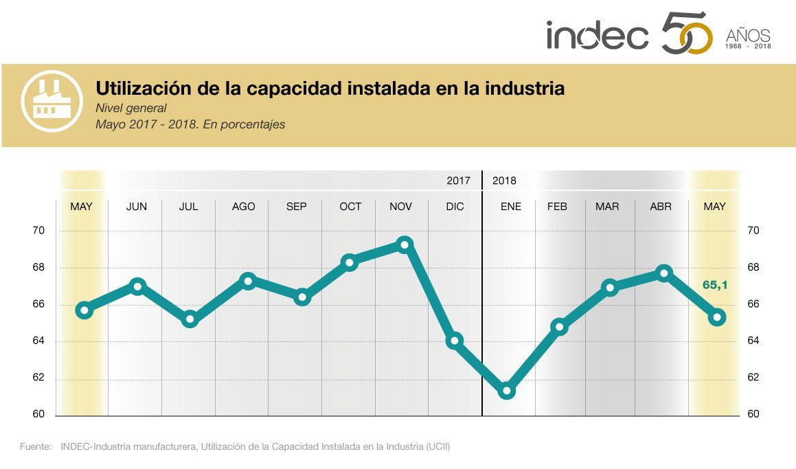 En mayo de 2018, la industria utilizó el 65,1% de su capacidad instalada: 0,7 puntos menos que en el mismo mes del año pasado, indicó esta tarde el Indec.