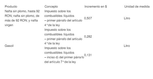 En el caso del gasoil, la modificación establecida será de $0,282 por litro, salvo que se destine "para consumo en Neuquén, La Pampa, Río Negro, Chubut, Santa Cruz, Tierra del Fuego, Antártida e Islas del Atlántico Sur, el partido de Patagones en la provincia de Buenos Aires y el Departamento de Malargüe de Mendoza, donde será de 0,131″, destaca Clarín.