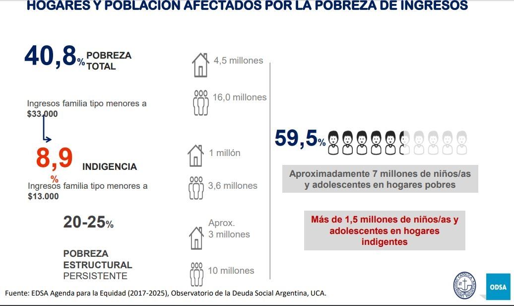 El 40,8% de las personas se encuentran por debajo de la línea de la pobreza. En total es un 32,1% de los hogares. Lo informó hoy el Observatorio de la Deuda Social de la Universidad Católica Argentina (UCA). Se estima que 6,5% de los hogares, y 8,9% de las personas, son indigentes.