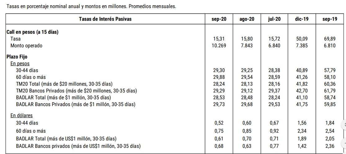 Respecto de los plazos fijos hubo una disminución en las tasas entre septiembre de 2019 y septiembre de 2020, como lo muestra el siguiente cuadro del Banco Central: