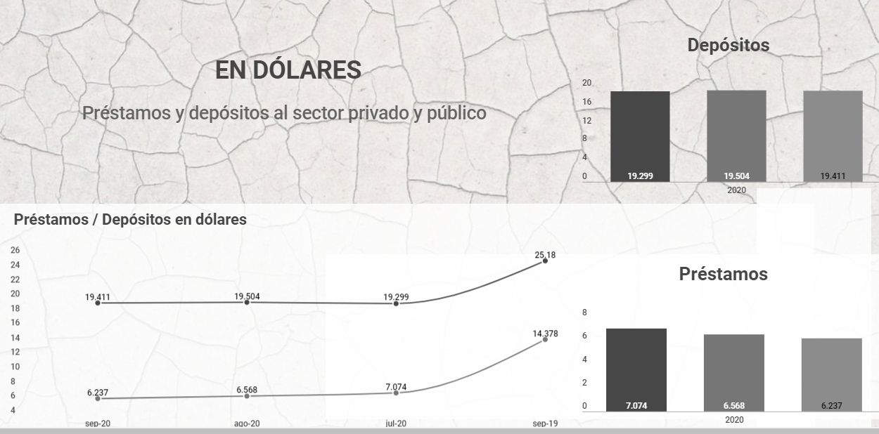En los últimos 12 meses, es decir, entre septiembre de 2019 y de 2020, según el último reporte mensual del Banco Central de la República Argentina, hubo caídas en las Reservas Internacionales (-15,8% y -1,9% en los últimos 30 días), en los depósitos del sector privado y del sector público en dólares (-22,5% y -0,5% en el último mes corrido) y -56% en los préstamos en dólares.
