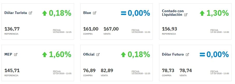 El dólar oficial, por su parte, avanza un 0,18% y se ubica en $82,89 para la venta y $76,89 para la compra. De esta manera, el dólar ahorro o turista se ubica en $136,77 al sumar el 30% del impuesto PAIS y el 35% de anticipo de impuesto a las Ganancias y Bienes Personales.
