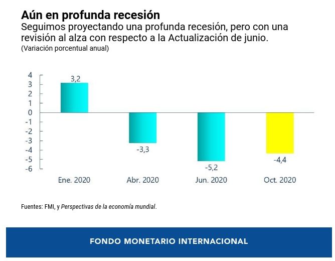 El Fondo Monetario Internacional actualizó los pronósticos de la evolución del PBI de Argentina: para 2020 proyecta una caída de 11,8% y para 2021, una recuperación de 4,9%, según consta el Panorama Económico Mundial (WEO, por sus siglas en inglés) actualizados este martes, informó clarin.com. En esta ocasión, como el organismo está negociando con Argentina, no incluyó en el informe las proyecciones de inflación y de déficit fiscal.