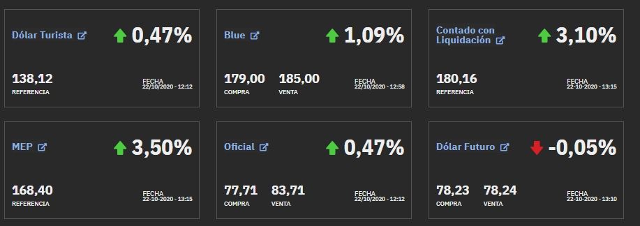 En el segmento oficial, el dólar mayorista sube 0,41% y cotiza a $78,07, mientras que el minorista llega a $ 83,71, lo que lleva al dólar ahorro o turista a $138,12 sumándole el 30% del impuesto PAIS y el 35% de anticipo de Ganancias y Bienes Personales.