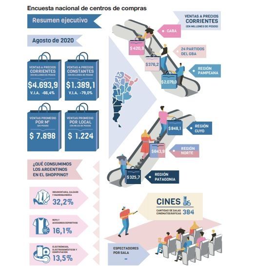 En agosto de 2020, los rubros que lideraron las ventas a precios corrientes de los centros de compras fueron: “Indumentaria, calzado y marroquinería”, que representó el 32,2% del total, seguido por “Ropa y accesorios deportivos” con un 16,1%, y el rubro “Electrónicos, electrodomésticos y computación”, que representó el 13,5%.