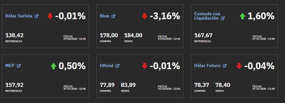Ayer los dólares alternativos arrancaron en alza y el Gobierno salió a bajarlos mediante la venta de bonos. Este martes, el contado con liqui, la operatoria que permite sacar divisas del país operando con bonos locales, sube 2% y se ubica en $ 168,36. La semana pasada llegó a tocar los $181 en medio de la incertidumbre. El dólar MEP o Bolsa, por su parte, sube 1,1% este martes y su ubica en $158,96.
