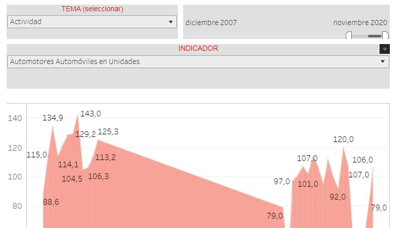 El siguiente informe interactivo es una visualización de los datos de la economía con indicadores mensuales en lo que va 2020 y a lo largo de 2019, 2015, 2007, 2003, 1999, 1989 y más atrás también (en algunos casos, con datos de principios del siglo pasado):