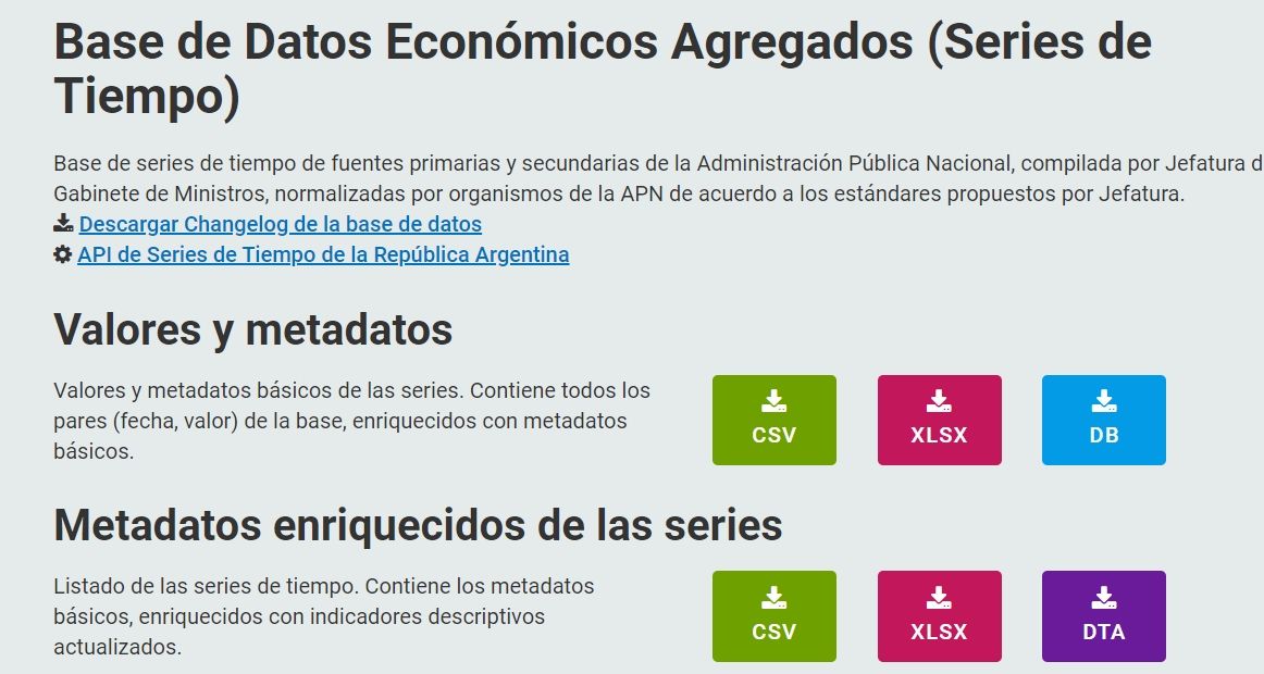 El Ministerio de Economía de la Nación tiene un portal de datos, con información actual e histórica de indicadores anuales, semestrales, trimestrales, mensuales y diarios (clic en la siguiente imagen).