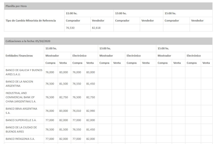 El dólar oficial, según el tipo de cambio referencia minorista, este lunes abrió en$76,53 para la compra y $82,61 para la venta, informó el Banco Central. Mientras que en las entidades bancarias de la city porteña, según el reporte de las 11 horas del Central, el dólar se cotiza así: