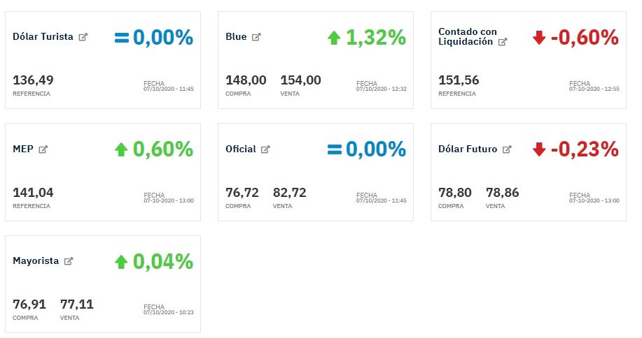 El dólar oficial, por su parte, se mantiene en $82,72 para la venta y $76,72 para la compra. Con el recargo del 30% del impuesto PAIS y el 35% de anticipo de Ganancias, el dólar ahorro o turista llega a los $136,49.