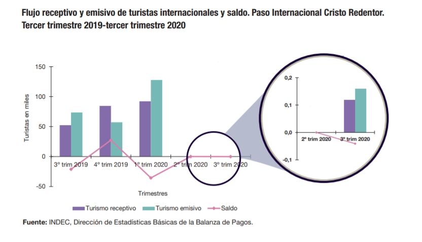 Duarnte el tercer trimestre de 2020, en el Paso Internacional Cristo Redentor se estimaron 0,1 mil llegadas de turistas no residentes, con una disminución de 99,8% respecto de igual período del año anterior. Se registraron 0,2 mil salidas al exterior de turistas residentes, con una disminución de 99,8% interanual. El saldo fue negativo en 41 turistas.