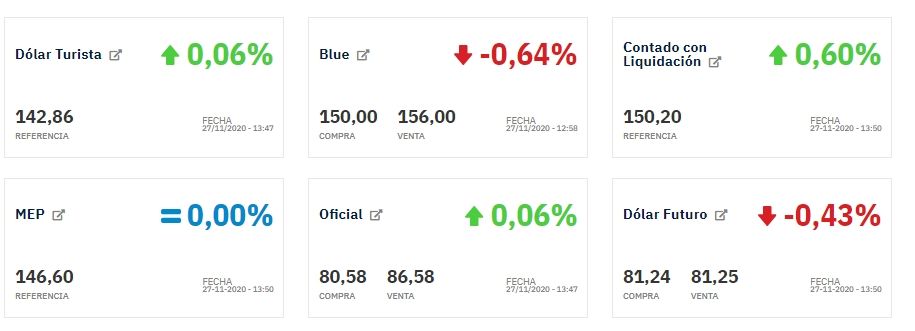 El dólar blue -la cotización informal de la divisa norteamericana- continúa bajando en el cierre de la semana y se ubica en $156 para la venta y $150 para la compra, un peso por debajo del cierre de ayer.