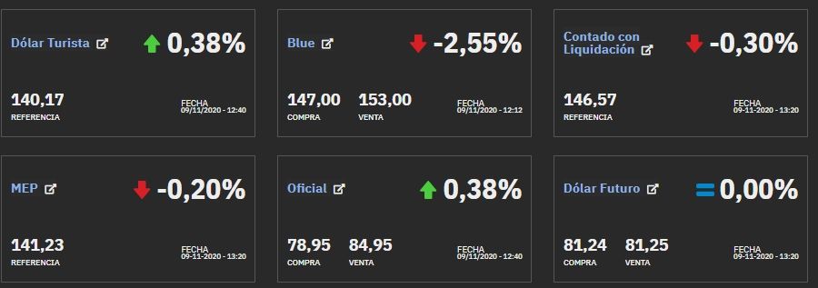 Con respecto a los dólares financieros, el contado con liqui baja levemente y se ubica en $146,56, mientras que el dólar MEP o Bolsa se mantiene en $141,37.