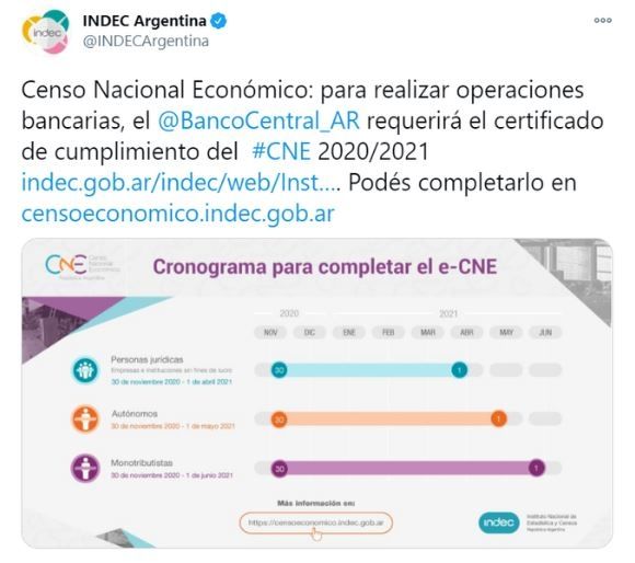 El Banco Central de la República Argentina (BCRA) prohibirá las operaciones bancarias a las 700.000 empresas y las 5 millones de personas físicas que no respondan un censo económico que lanzó el Instituto Nacional de Estadística y Censos (Indec). Las personas que contesten el formulario seguirán estando habilitadas.