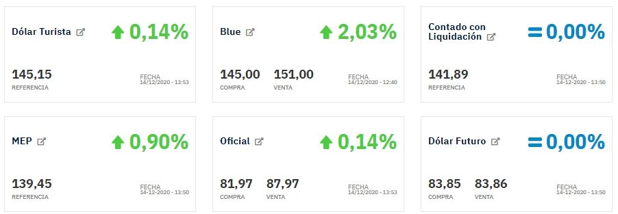 El dólar oficial se vende a $ 87,91 en el segmento minorista, mientras que el mayorista -en el que operan los bancos y las grandes empresas- sube 25 centavos y llega a $ 82,47. De esta manera, la brecha con el dólar blue se ubica en 84%.