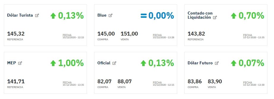 El dólar oficial se vende a $ 88,07 en el segmento minorista, mientras que el mayorista -en el que operan los bancos y las grandes empresas- sube 6 centavos y llega a $ 82,53. De esta manera, la brecha con el dólar blue se ubica en 84%.
