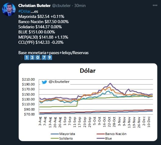 "La tendencia del dólar libre es alcista, primero porque la propia devaluación del oficial más los impuestos le sube el piso diariamente; segundo porque el BCRA sigue emitiendo pesos para financiar al Tesoro y diciembre es un mes de gasto alto", anticipó el analista financiero Christian Buteler en diálogo con El Cronista.