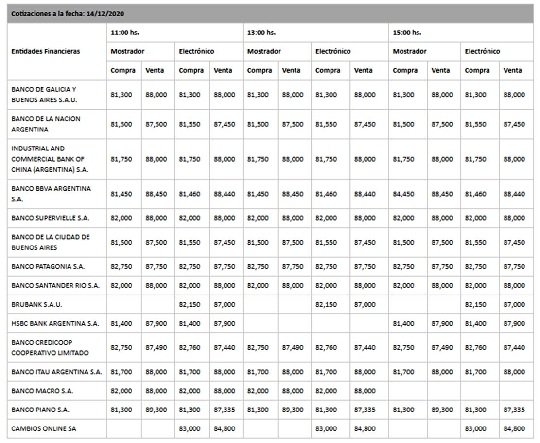 Hoy lunes 28 de diciembre de 2020, el dólar oficial en los bancos alcanzó un valor máximo de $ 91, 1 la unidad para la venta. Según información del Banco Central, en el Banco Piano este lunes se cotizó a ese valor, mientras que en el resto de las entidades a partir de los $ 86 la unidad para la venta (ver el listado).