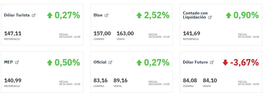 De esta manera, el dólar blue acumula una suba de 117% durante 2020. Con esta cotización, la brecha respecto del dólar oficial mayorista se ubica en 94%, aún bastante por debajo del 150% alcanzado a fines de octubre.