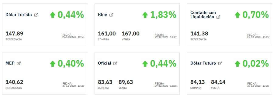 De esta manera, la cotización informal acumula una suba de 118% durante 2020. Con esta cotización, la brecha respecto del dólar oficial mayorista se ubica en 95%, aún bastante por debajo del 150% alcanzado a fines de octubre.