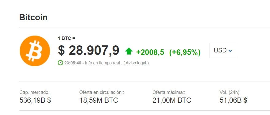 En base al tablero de cotización de la página especializada CoinMarketCap, el Bitcoin cotizaba este miércoles a US$ 28.644, con una suba de 6.37% respecto del cierre de ayer, por lo que, desde que superó los US$ 20.000 por primera vez el 16 de diciembre último, la criptomoneda más famosa del mundo trepó más de un 40% en tan sólo dos semanas.