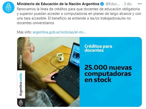 El Ministerio de Educación y el Banco de la Nación Argentina, con el apoyo del Ministerio de Desarrollo Productivo, renovaron la línea de créditos para que docentes de educación obligatoria -que perciben el Fondo Nacional de Incentivo Docente (FONID)- y superior puedan acceder a computadoras en planes de largo alcance y con una tasa accesible, muy inferior a la de mercado. El beneficio se extiende a las trabajadoras y los trabajadores no docentes universitarios.