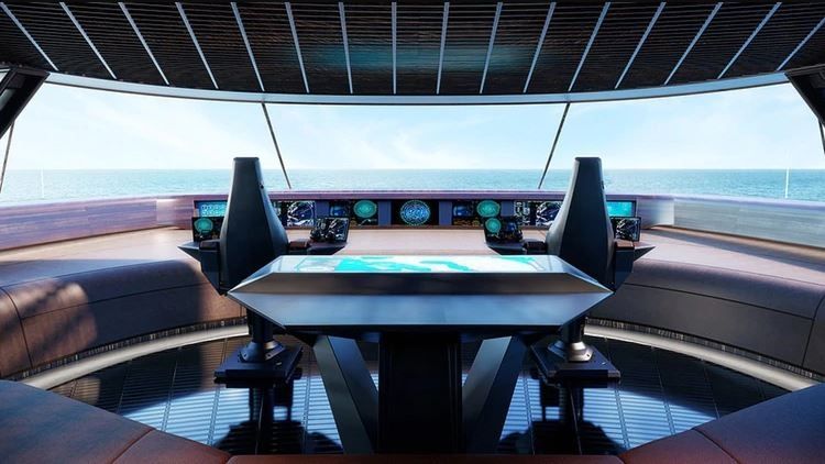 El estudio de diseño Sinot dijo que el exterior del barco se inspiró en el oleaje del océano, el movimiento de las mareas y el tiempo en el mar abierto.
