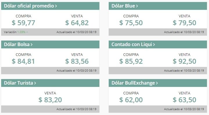Por su parte, el dólar turista se vendía a $83,20, mientras que el conocido como "dólar bolsa" operaba en $84,81 para la compra, y $83,56 para la venta.