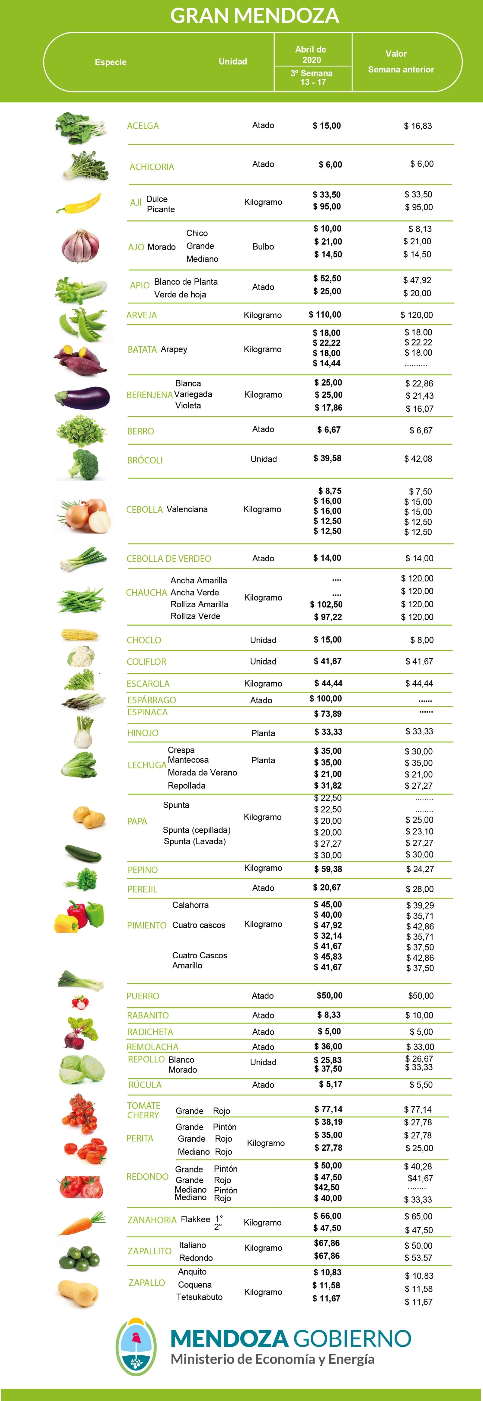 El tercer relevamiento fue realizado por el Ministerio de Economía y Energía y el Instituto de Desarrollo Rural (IDR) en las principales ferias y mercados de frutas y hortalizas en el Gran Mendoza y en San Rafael, enmarcándose en una política de control de precios impulsada por el gobierno provincial para impedir que los valores se disparen en forma desorbitada e injustificada durante las medidas de aislamiento social.