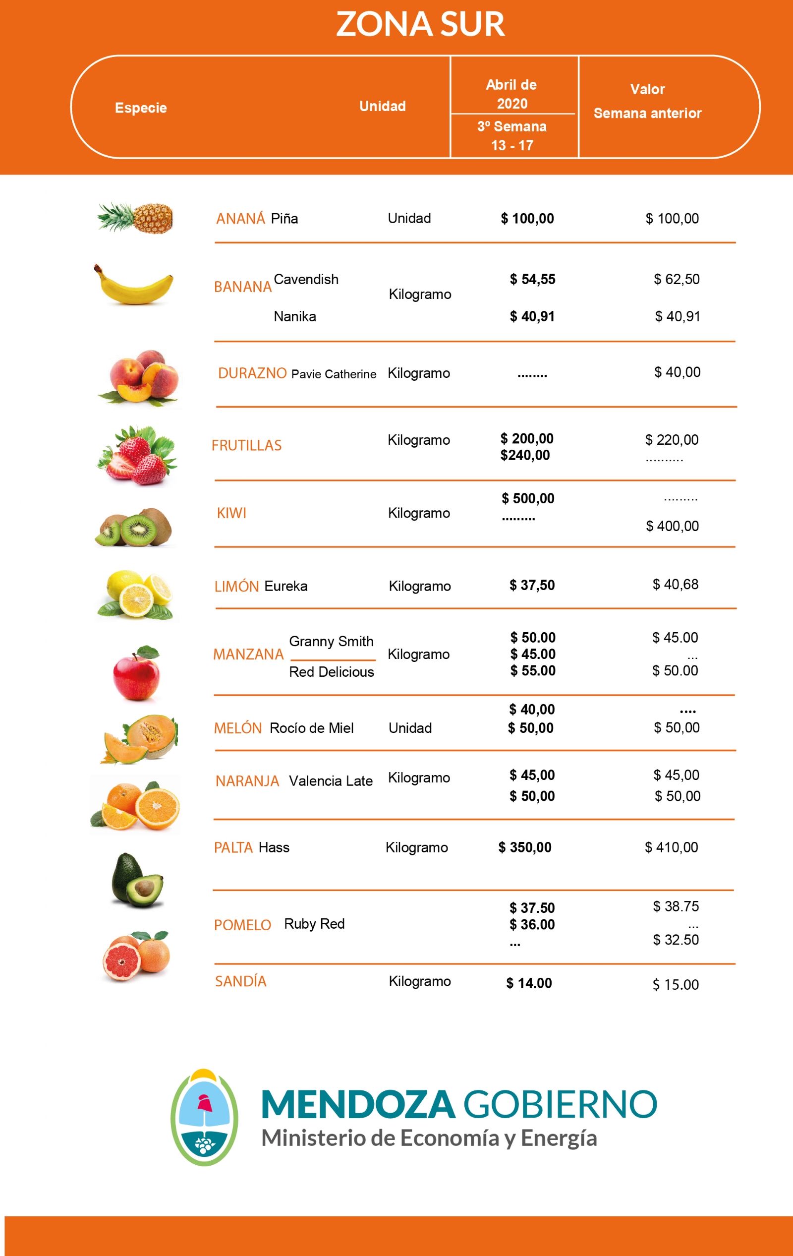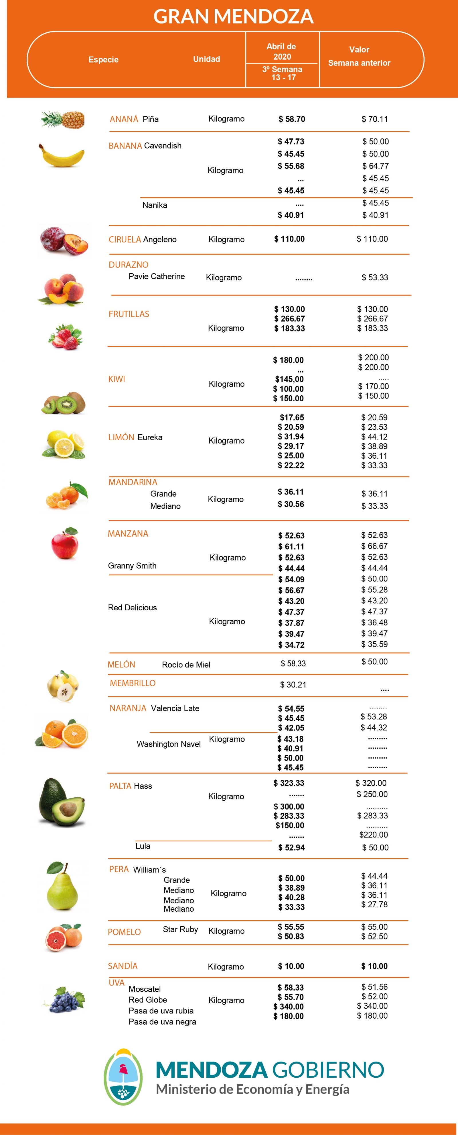 Dicho listado detalla la procedencia de los productos, la variedad a la que pertenece, cómo es vendida, por kilo o por unidad, y el precio de venta del 13 al 17 de abril.