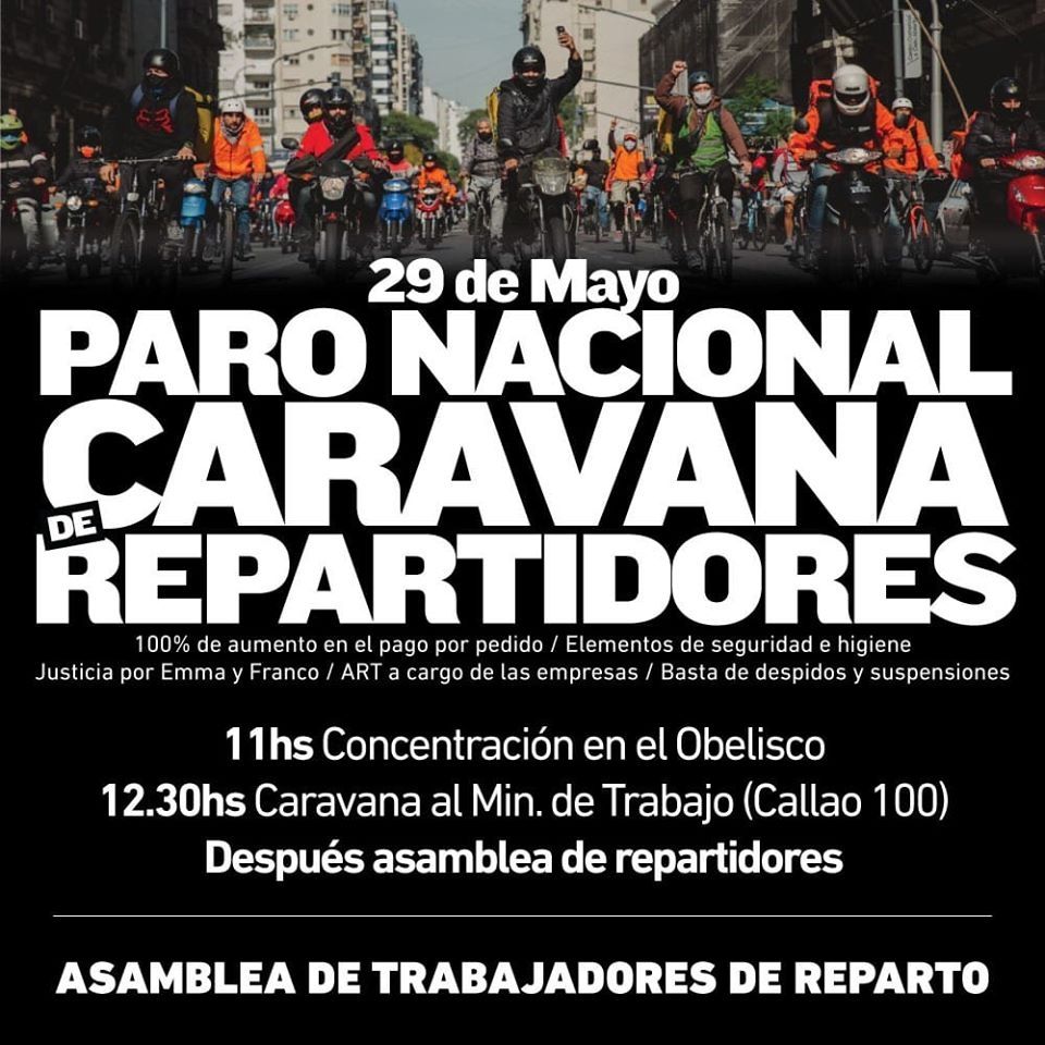 Desde la Agrupación Trabajadores del Reparto (ATR) convocaron a un paro nacional de trabajadores de deliverys para el viernes 29 de mayo con caravanas en todo el país.