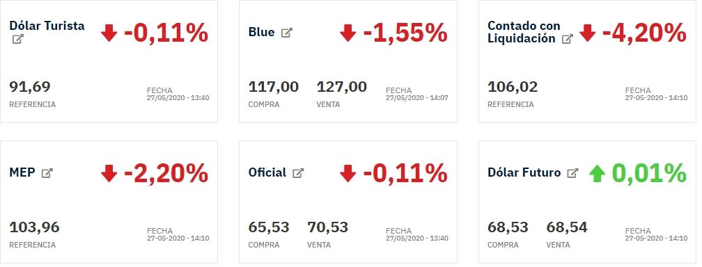 El dólar blue, por su parte, también baja este miércoles y se ubica en $127 para la venta y $117 para la compra. Ayer había subido tres pesos y había llegado a $129.