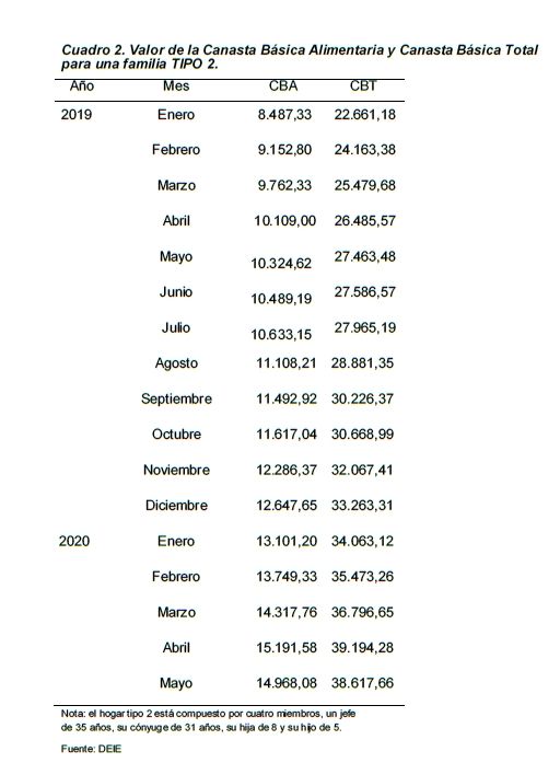 Las líneas de pobreza e indigencia de mayo de 2020 para una familia Tipo 2 (está compuesto por cuatro miembros: un/a jefe de hogar de 35 años, su cónyugue de 31 años, su hija de 8 años y su hijo de 5 años) son de $38.617,66 y $14.968,08 respectivamente.